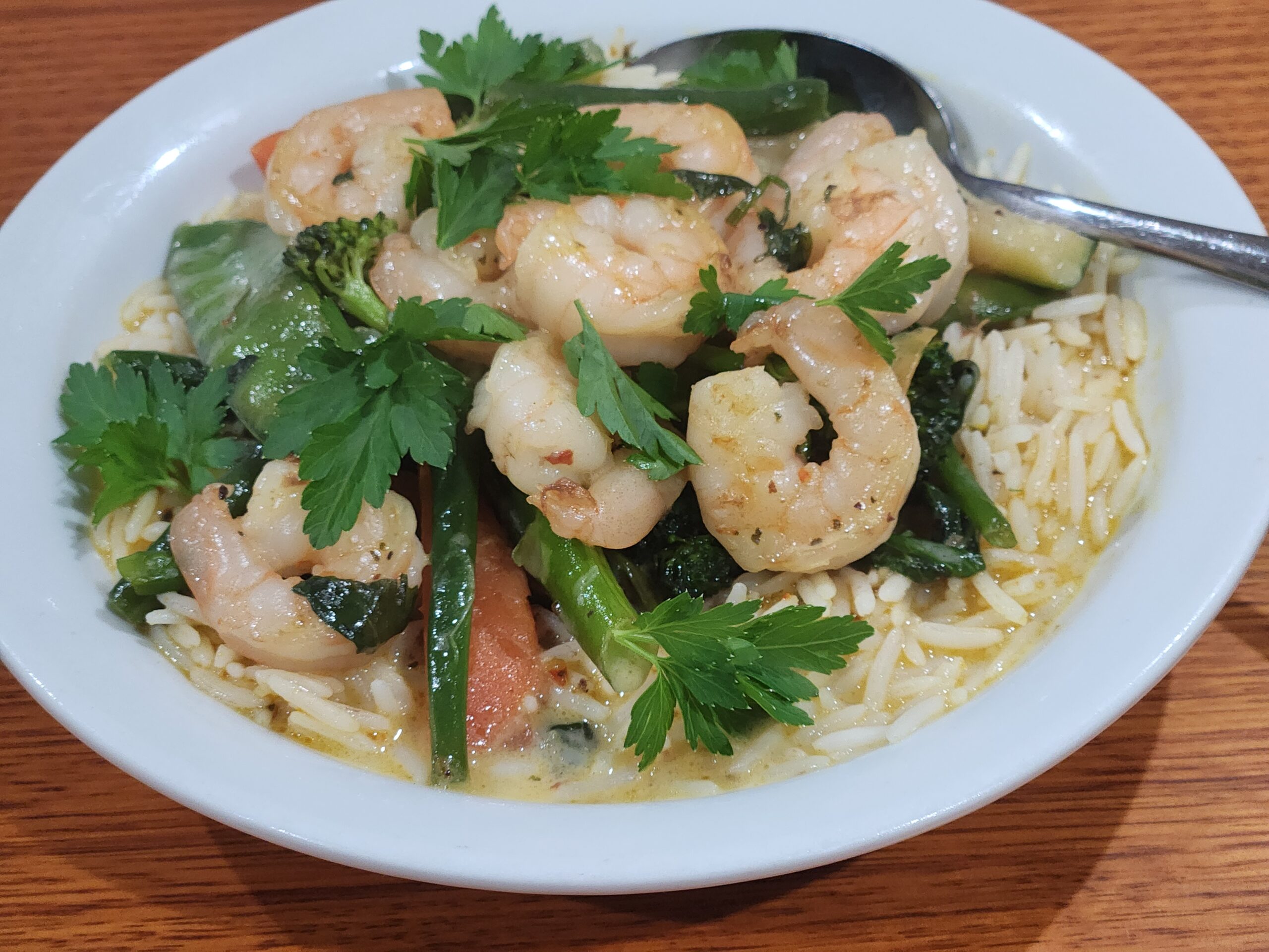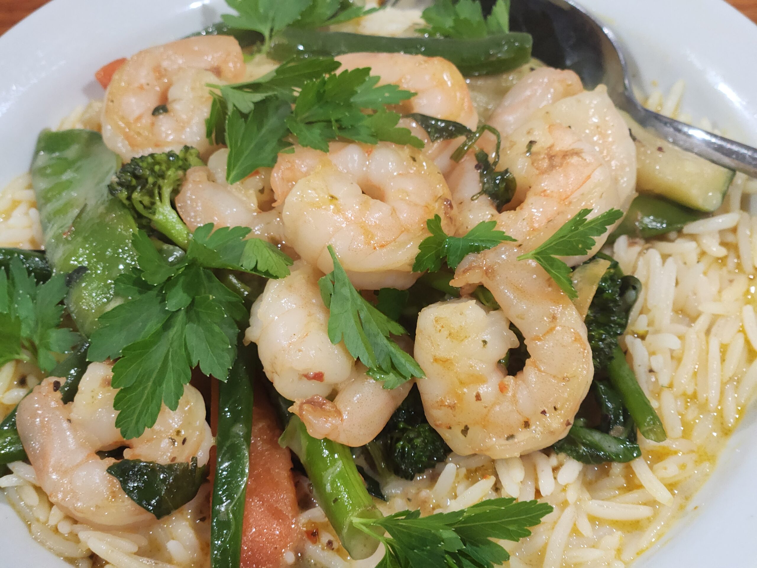 Tender Pranw, cilantro, shallots, ginger, bok choy, carrots, snow peas, red capsicum beans, garlic, rice, lime,